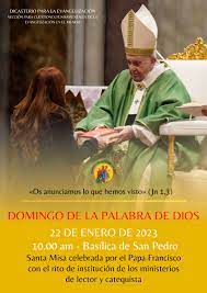 El tercer domingo del tiempo ordinario, en esta ocasión el 22 de enero, la Iglesia celebra el Domingo de la Palabra de Dios con el lema «Os anunciamos lo que hemos visto» (1Jn 1, 3). Una Jornada que instituyó el papa Francisco con el fin de dedicar un domingo completamente a la Palabra de Dios. «Os anunciamos lo que hemos visto» (1Jn 1, 3).